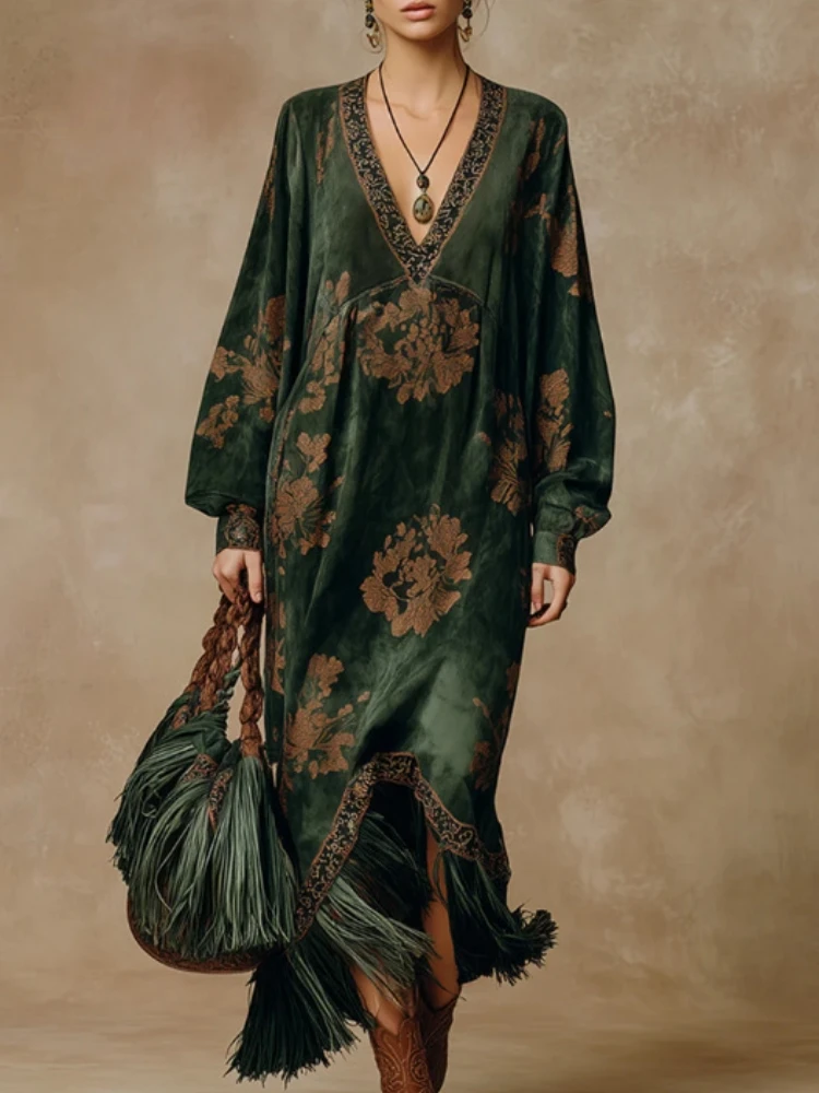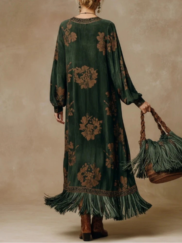 Elegant Women’s Boho Maxi Dress – Suede, Fringe & Floral Tassel Design
