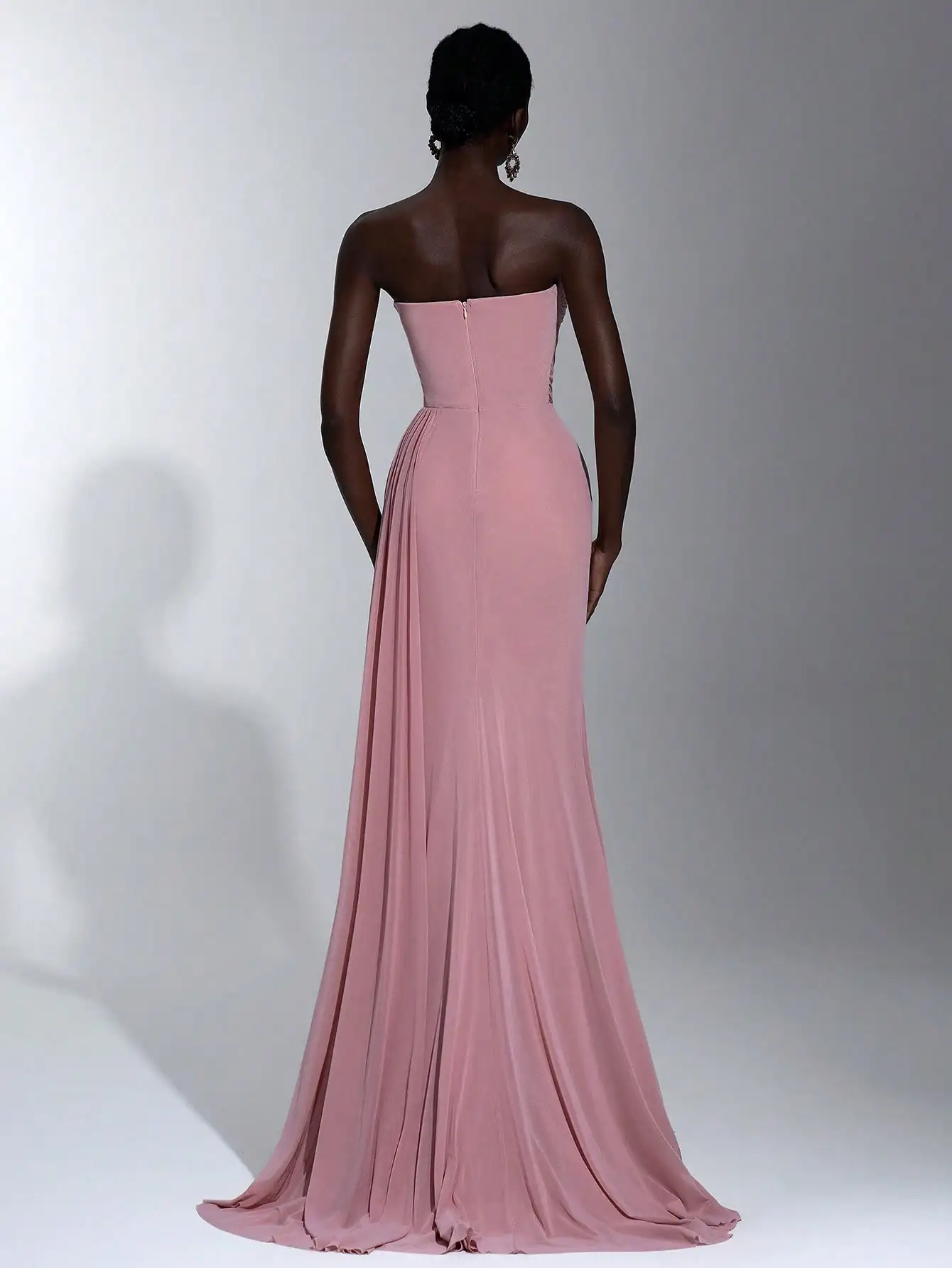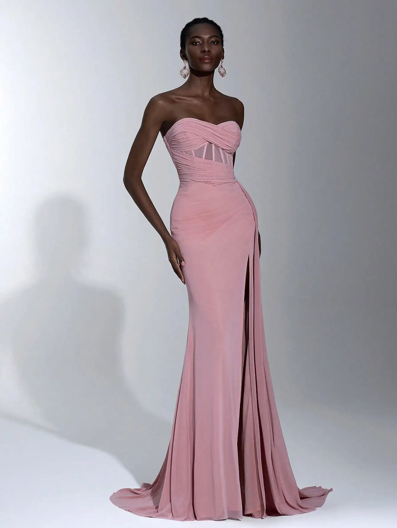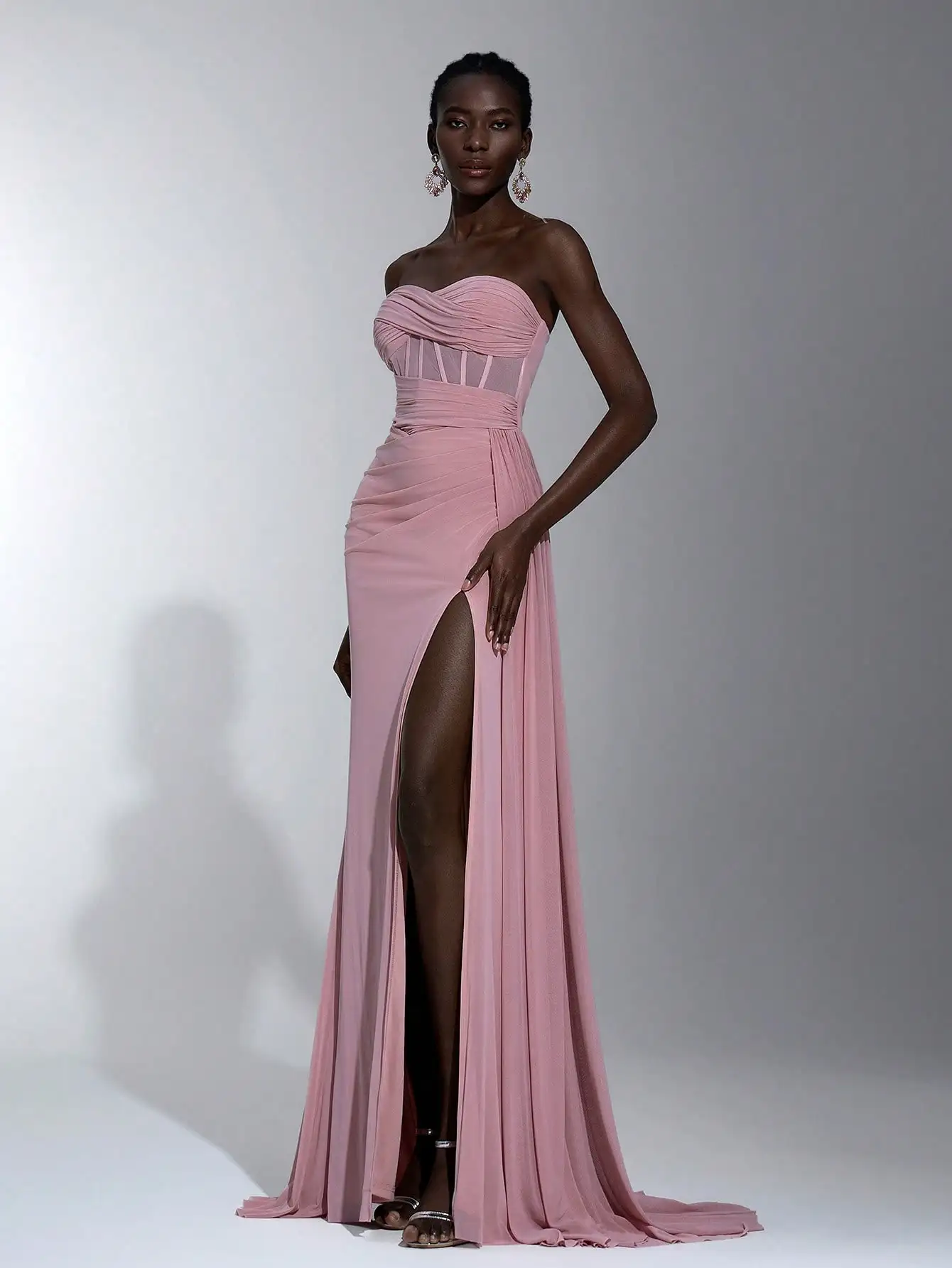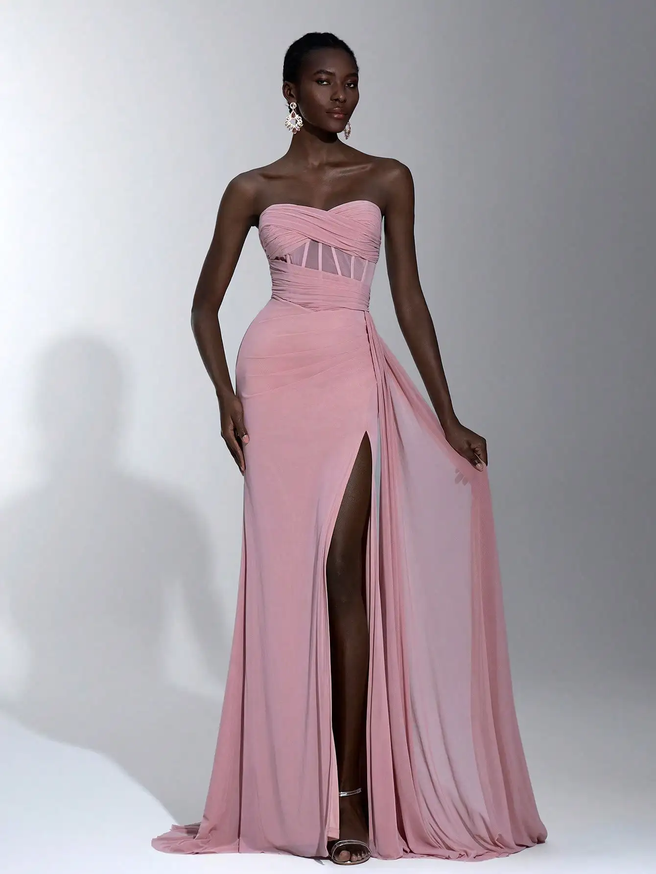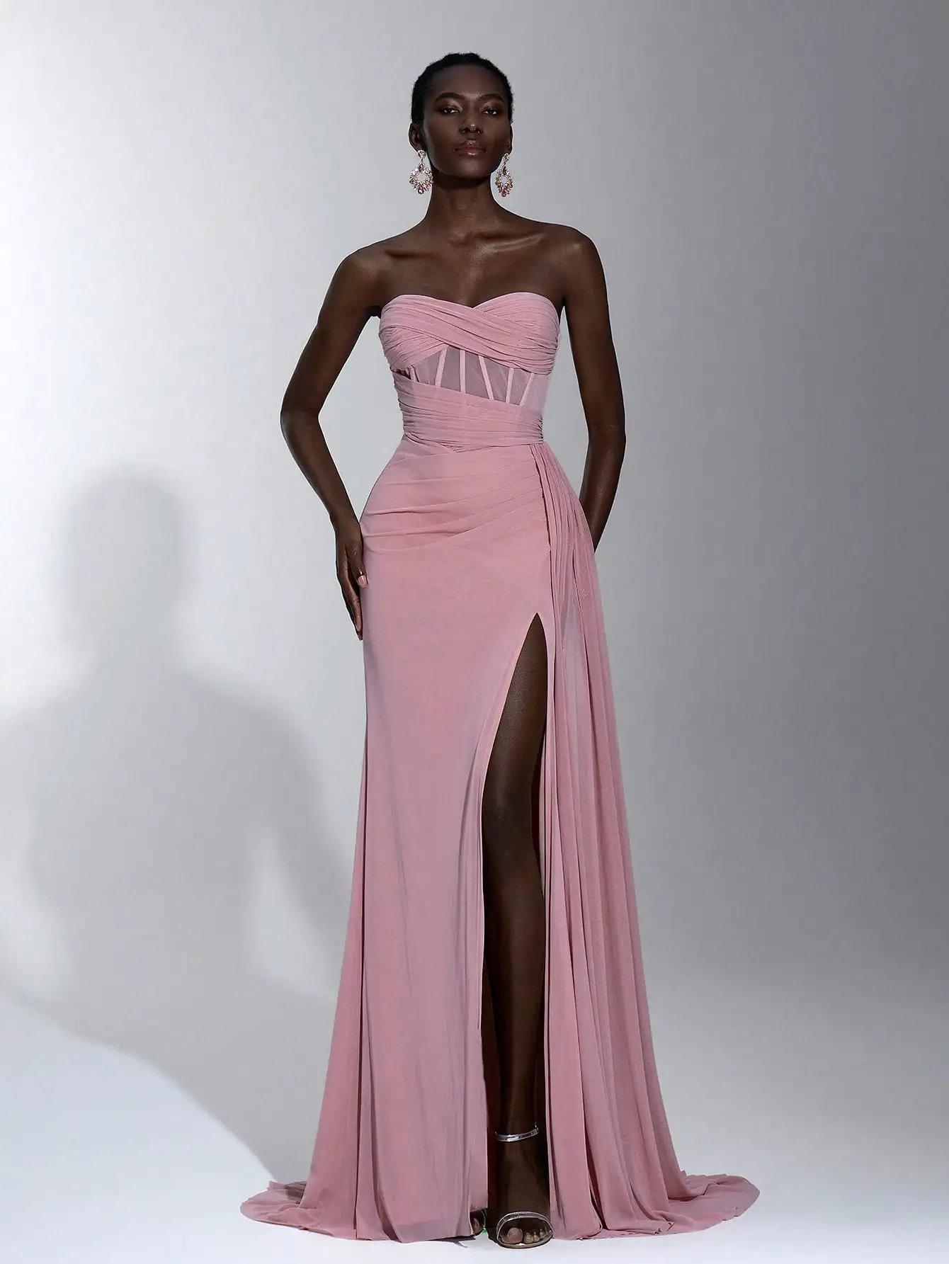 This strapless maxi dress combines elegance and comfort with fashion-forward details like the twisted bodice, sheer panel, and high slit. Its flattering A-line silhouette and soft pink color make it a perfect choice for evening celebrations and wedding guest attire.